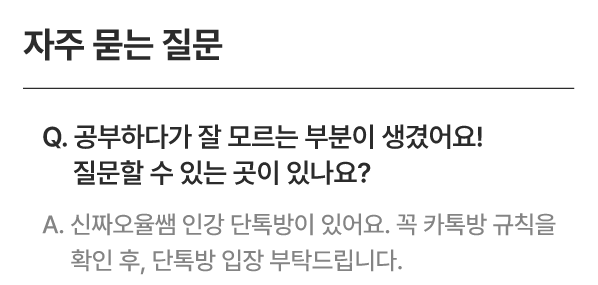 A. 신짜오율쌤 인강 단톡방이 있어요. 꼭 카톡방 규칙을 확인 후, 단톡방 입장 부탁드립니다.