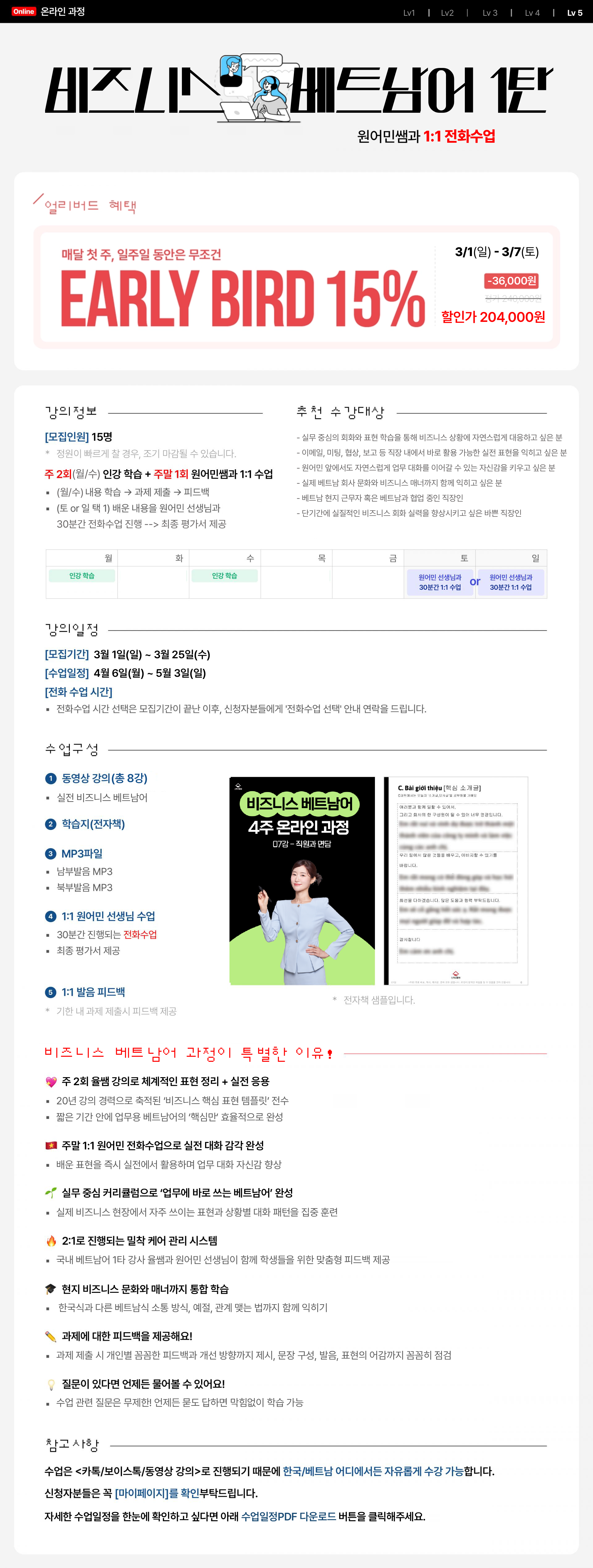 추천대상 자연스럽게 업무 대화를 하고 싶은 분 추천레벨 중급, 중고급 수업일정 4월 6일(월) - 5월 3일(일) 강의정보 주 2회 강의 + 주말 1회 1:1수업 특별혜택 얼리버드 15% 할인 (~3월 7일)