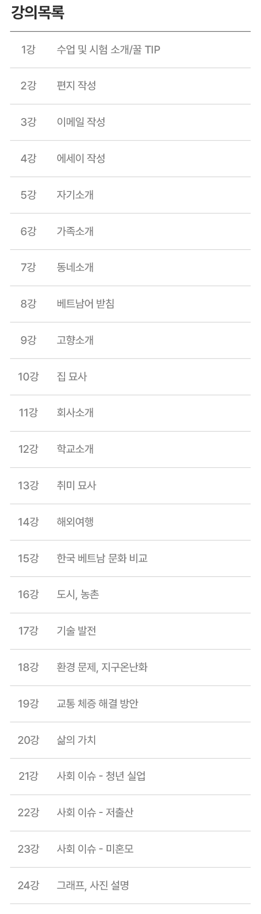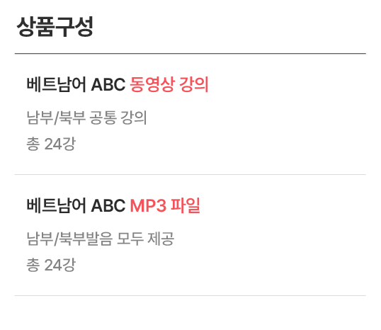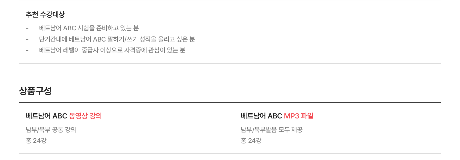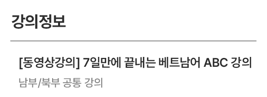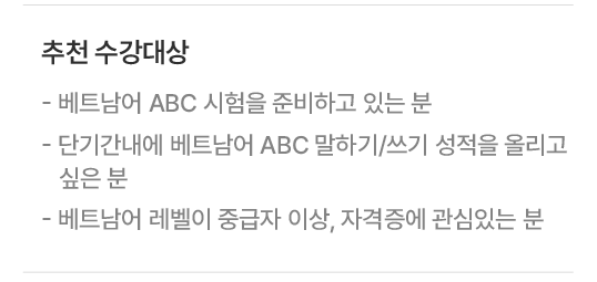 추천대상 ABC시험 말하기/쓰기 파트 준비 추천레벨 초중급 ~ 중고급 강의목록 총 24강 발음종류 남부/북부 공통 수강일수 180일/한국∙베트남 배송가능