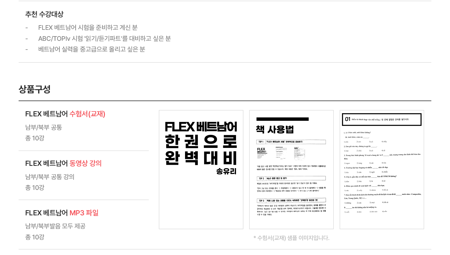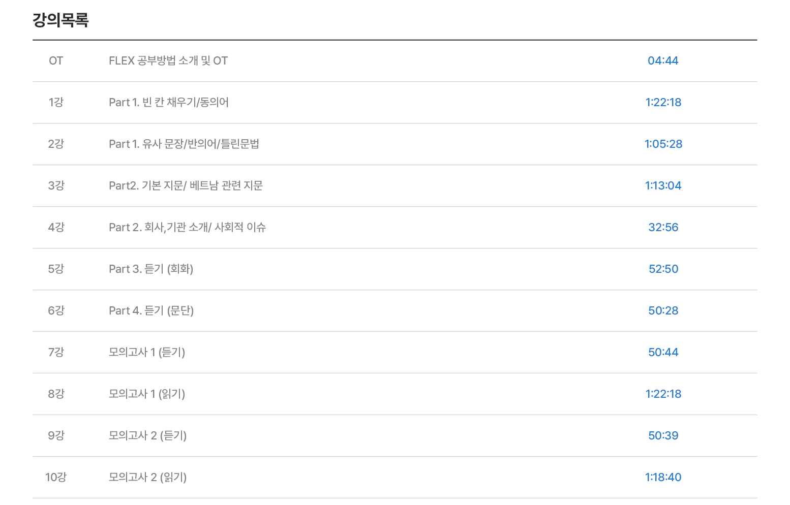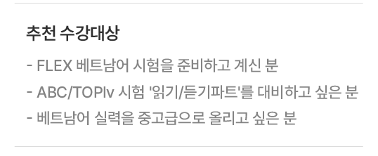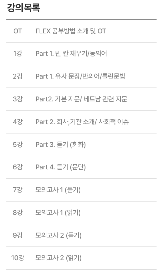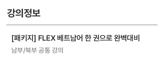 추천대상 FLEX 시험을 혼자 준비하는 분 추천레벨 초중급 ~ 중고급 강의목록 총 10강 발음종류 남부/북부 공통 수강일수 180일